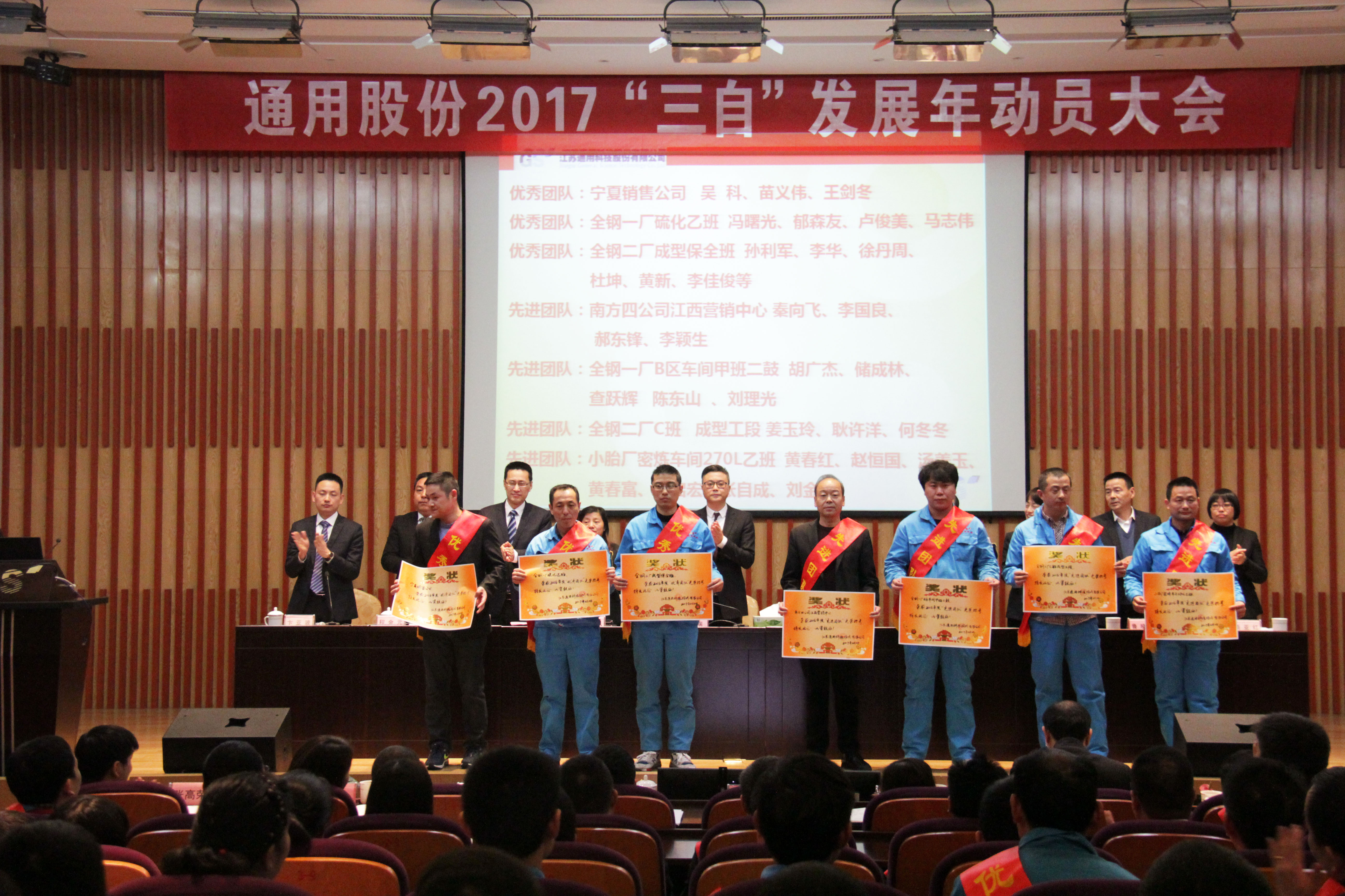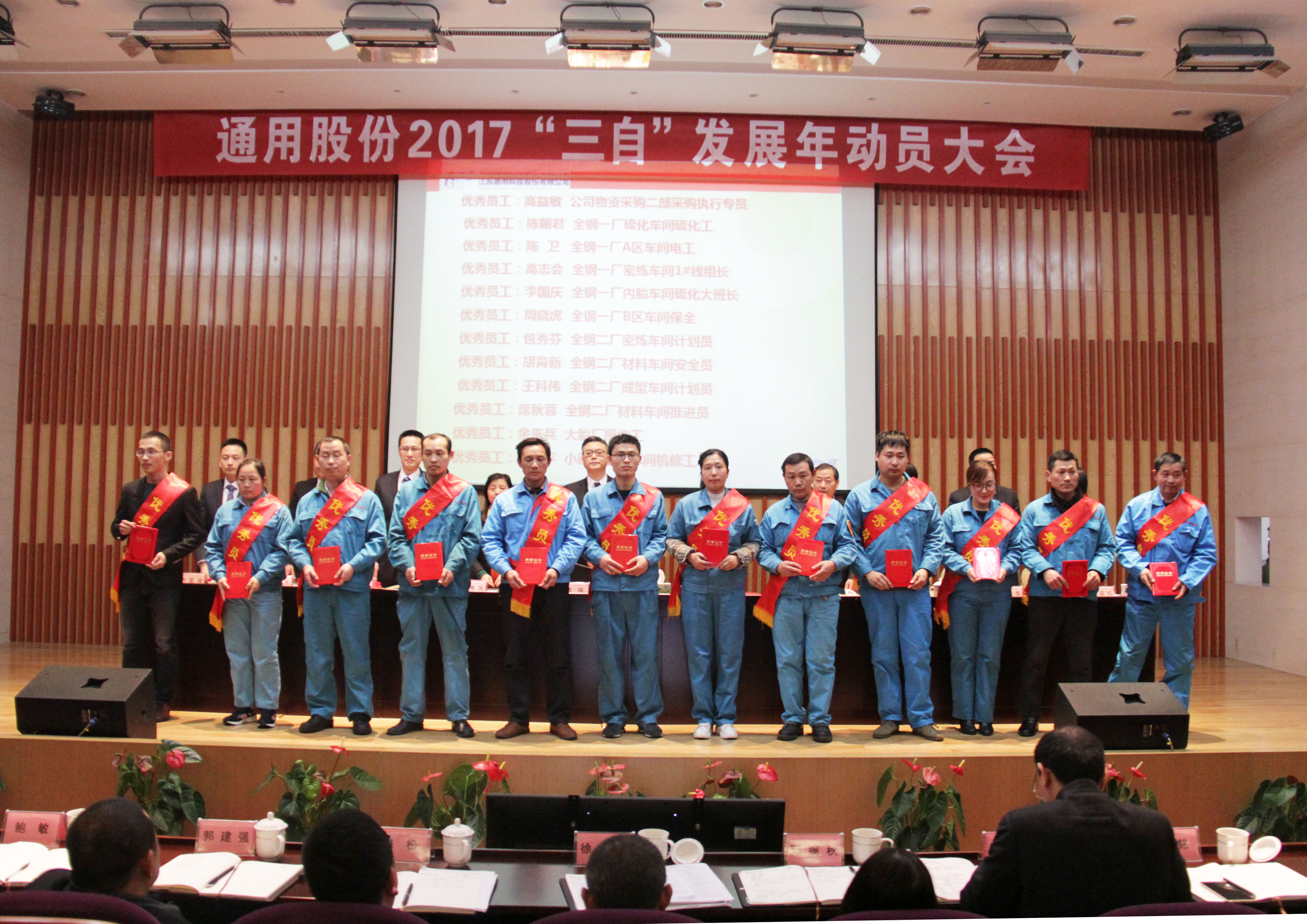 過(guò)去的2016伴隨著國(guó)民經(jīng)濟(jì)進(jìn)入新常態(tài),輪胎行業(yè)迎來(lái)了新一輪的挑戰(zhàn)。在全體通用人的奮斗拼搏下,通用股份不僅實(shí)現(xiàn)了IPO在上海證券交易所的成功上市,同時(shí)公司經(jīng)營(yíng)保持著強(qiáng)勁的發(fā)展勢(shì)頭,取得了驕人的成績(jī)。這是通用人智慧與汗水澆灌的結(jié)晶。大會(huì)隆重表彰了100名先進(jìn)和優(yōu)秀員工及團(tuán)隊(duì),他們默默耕耘在各條戰(zhàn)線上,以敬業(yè)奉獻(xiàn)與開(kāi)拓進(jìn)取詮釋了拼搏的價(jià)值,是所有人學(xué)習(xí)的楷模。