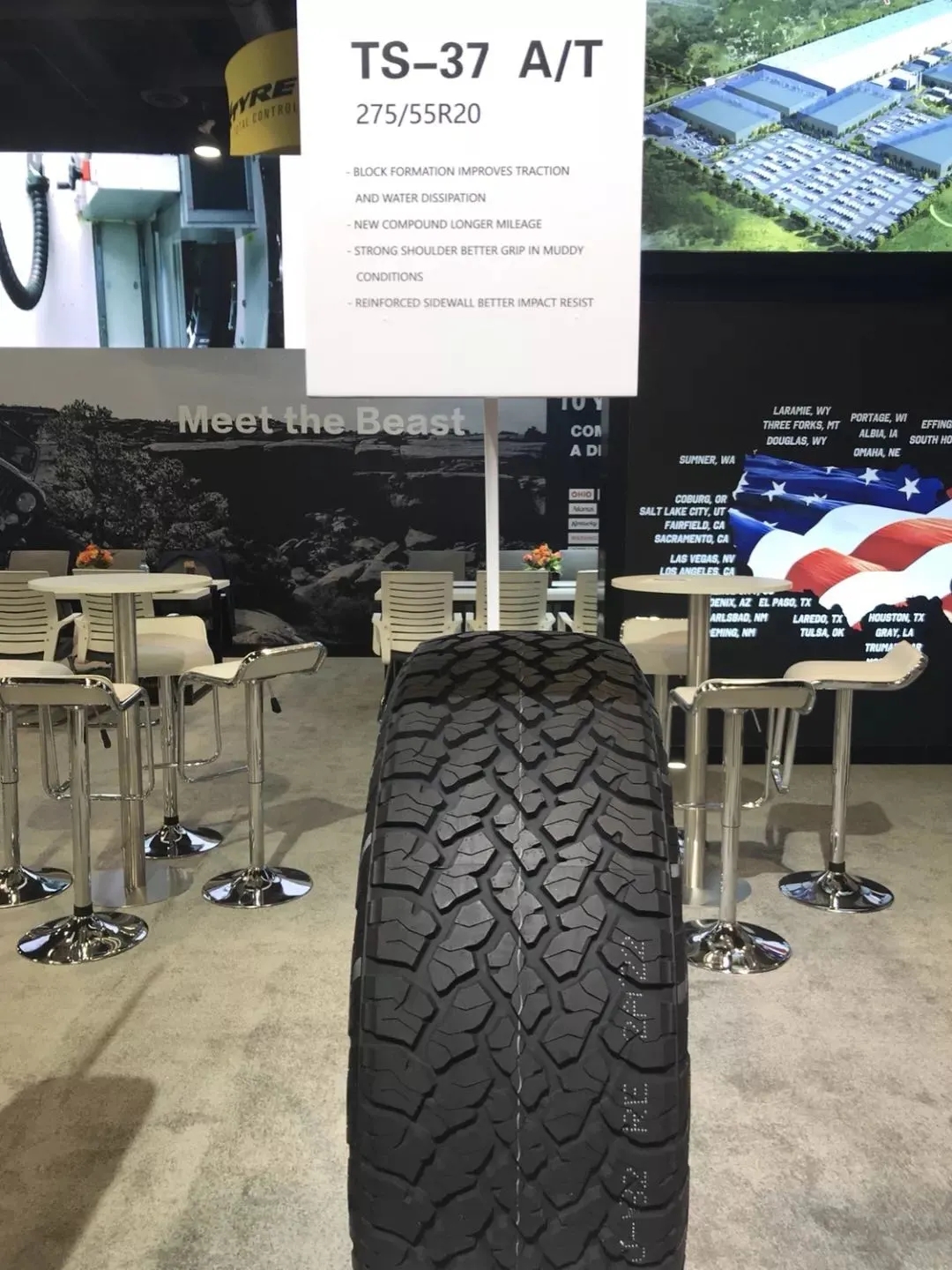 通用股份TBBTIRES品牌登陸美國市場以來,銷量不俗,深受國外市場青睞,參展的觀眾也經(jīng)常針對性的參觀并咨詢相關(guān)問題。本次SEMA展會上,TS-07H/T、TS-37 A/T等一系列性能優(yōu)異的輪胎產(chǎn)品受到了外國客戶們的一致好評。