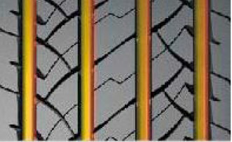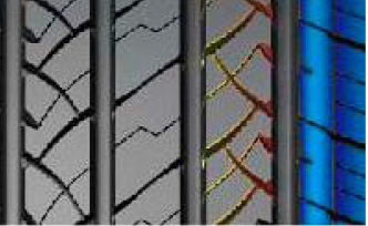增加胎面的咬合邊,提高剎車和濕地安全性能。切割花紋防止花紋塊在剎車時發(fā)生卷邊效應(yīng),增大接地面積。