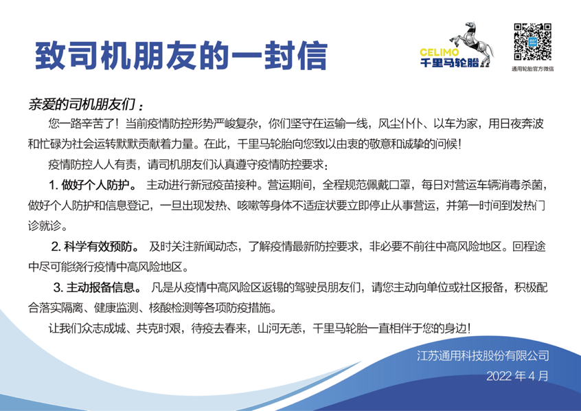 外抗疫情,內(nèi)穩(wěn)生產(chǎn),自3月以來,通用股份抗疫生產(chǎn)兩不誤,在保證生產(chǎn)的同時(shí),志愿者團(tuán)隊(duì)深入社區(qū)和高速卡口,開展了上百次愛心服務(wù)行動(dòng)。病毒雖能將我們隔離,但是通用輪胎“大白”的心與貨運(yùn)司機(jī)的心始終是聯(lián)系在一起的。無論山河無恙,還是披荊斬棘,千里馬輪胎都會(huì)一直陪伴在您的身邊,與您攜手同行!